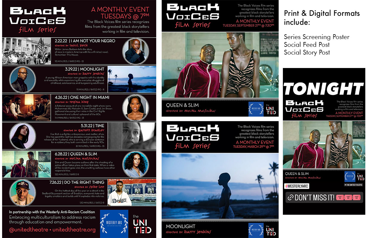Each project began with immersion in The United’s mission — “to UNITE the community through the arts.” I translated that mission into visual form by prioritizing tone, typography, and rhythm: minimalist layouts punctuated by expressive photography and dynamic headlines.