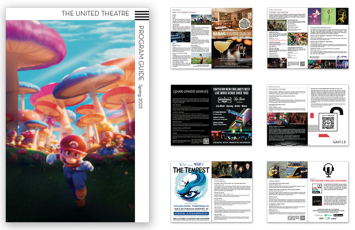 Editorial Design: concepted and designed The United Theatre Program Guide, integrating event calendars, educational programs, membership features, and regional advertising.
